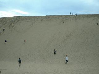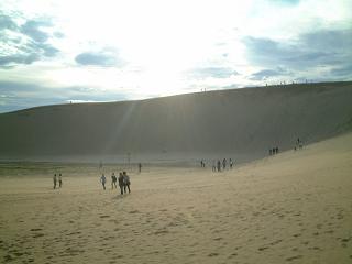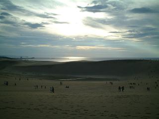 ![]() そして、次に向かったのが鳥取砂丘。今回の旅のメインの地。 いやー、凄かった。。。。 まさか、鳥取砂丘がこんな凄いもんやとは思ってもみんかった。もっとしょっぼい小じんまりしたもんを想像しててんけど、来て見てびっくり、その眺めには圧倒されずにはおれんかった。俺らが来た瞬間、1日中続いてた曇天が一瞬晴れたってのもらっきーやったけど、それにしても鳥取砂丘、これはちょっと甘く見たらあかんねと思った。 とりあえず、勢い勇んでダッシュで砂丘の頂上まで行くと、風がめちゃめちゃきつかった。全身に砂塵が次から次へと叩きつけられて、めちゃめちゃ痛かったし・・・・。しかも、左の写真に見える斜面をダッシュで駆け上がったら、脚がふつーにつりそうになってたし・・・・。‘四捨五入して三十路’までまだ10日強あるとはいえ、おっさんには見た目よりかーなりキツかった。でも、そんながんばって登り切ったご褒美か、頂上から見る日本海はなかなかにキレイやったけどね。 てなわけで鳥取砂丘、これはかなりおすすめなとこになったかも。ちょっと行きにくい所にはあるけど、わざわざ行く価値ってのは十分にあるかもよ。 鳥取砂丘を満喫した二人は、リサーチしておいた近くの旅館へと夜飯を食べに向かった。そこはS曰く、海鮮丼がめちゃめちゃうまいと評判の旅館てことやった。しばらく放浪しながらもなんとか旅館を発見すると、細い道を通り、やや狭めの駐車場に車を止めようとした。 その時、、、、 あ、、、、やってまった・・・・。 車ってこんな簡単にへっこむもんなのね。。。。 はっきりゆって何てことないただの駐車場やった。確かに、ちょっと狭いとゆえば狭かったかもしれんけど、ふつーに止めれば当てる要素なんか何一つないところやった。ただ、唯一にして最大の問題やったんが、俺が車庫入れが超苦手やったてこと。。。。(T_T) 結局、警察を呼んで事故証明を取ったりして、無意味に大事になってまった。しかも、更に追い討ちをかけたんが、その旅館がGW 中は食事のみのご利用はできません てことやった。つまり、せっかくここまで来たのに、海鮮 丼なんかかけらも食べれませんてこと・・・・。もう、ほんま踏んだり蹴ったり。。。。でも、当てた車のおっちゃんがいい人やったんが唯一不幸中の幸いやったか。 宿のおっちゃんに夜飯食えるとこを他に紹介してもらうと、丁重にお詫びをして、その旅館を後にした(修理代はもちろん後日しっかり請求とゆうことで・・・・)。 で、その紹介された店に行ってみると、、、、 ここって、ふつーの食堂やん・・・・。 俺ら、海鮮もんを食べに来たんですけど。。。。(T_T) 車当てて、海鮮丼は食べれず、なぜかこんな海沿いで夜飯はおでん定食・・・・。俺ら一体こんなとこまで来て何やってんねやろ。。。。